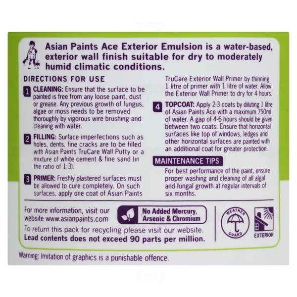 Asian Paints Ace Exterior Emulsion is a water-based exterior wall finish suitable for dry to moderately humid climatic conditions. Better performance ACE offers excellent resistance to chalking, cracking and weathering in comparison to cement paint.