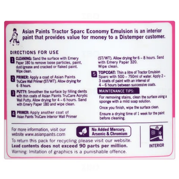 Asian Paints Tractor Sparc economy emulsion gives a smooth finish to your walls. An interior paint that provides value for money, especially when compared to distemper. .