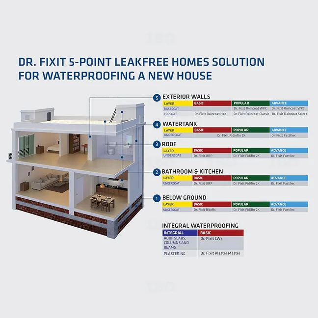 Dr. Fixit is a market leader in modern waterproofing to create leak-free, damp-free India and is one of the top-selling brands of Pidilite group. Dr. Fixit offers comprehensive system solutions for Waterproofing a new home or Repairing an existing one. The product range includes wide variety of new construction and repair waterproofing solutions for all critical surface areas like Roof, External Walls, Structure, Foundation, Internal Walls, Bathrooms and Water Bodies. Dr. Fixit products are created at modern R&D centers in India, Middle East and Singapore. Dr. Fixit offers a wide range of innovative construction chemicals in waterproofing, building repairs, tile fixing, sealants, coatings and paints, grouts and anchors and industrial floorings.