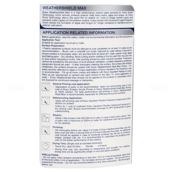 | Usage Information | | Dry Film Thickness (In Microns): 75-90. | Drying-Time- Surface Dry: 30 Min. | Recoating: Min 4-6 Hrs. | Thinning: Dilute 1L of Paint With 400-500 ml of water. In case of Dark Colors, Dilute 1L of Paint with maximum of 250 ml of water. | Stability Of Thinned Paint: 24 Hrs |