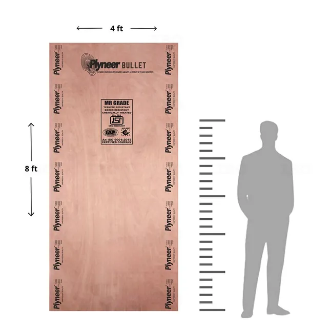 Plyneer Bullet MR Hardwood Commercial Plywood is made with selected seasoned hardwood and soft wood veneers and centre core of Vatta/ Eucalyptus and mixwood to give superb nail holding strength. It is bonded with Urea Formaldehyde Glue/ Resin under computer controlled temperature and pressure. bonded face to face with the grain running in alternate directions or cross bonding which gives our material its core strength.